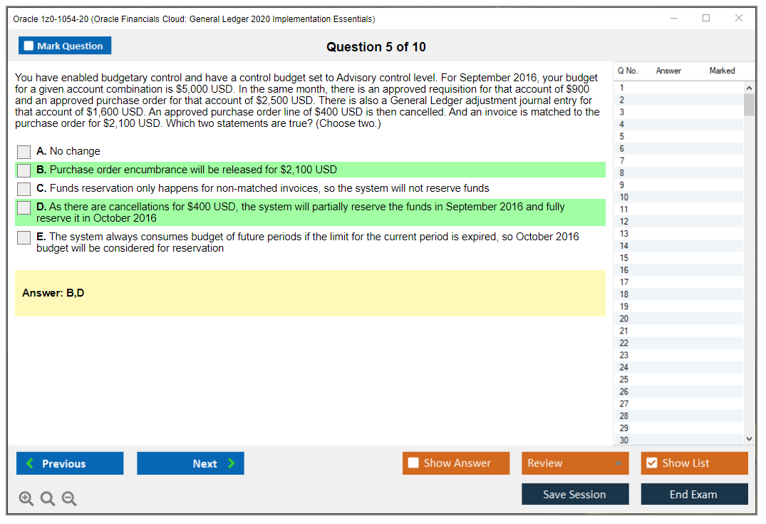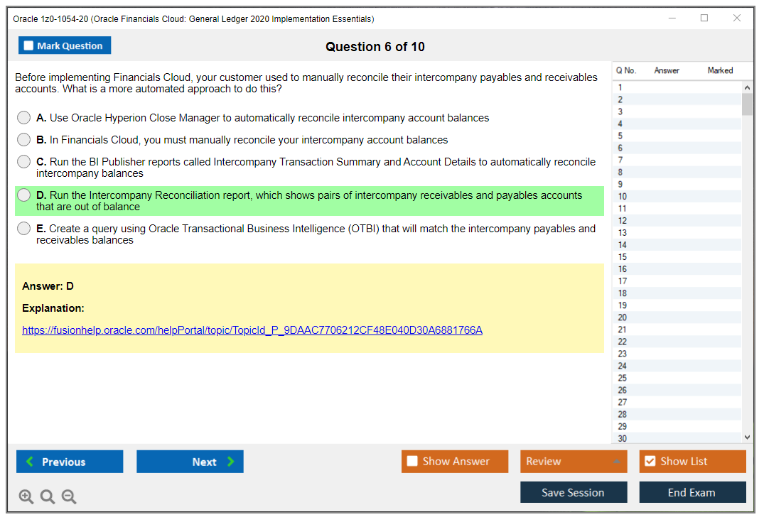 Les fichiers d'examen DumpsArena pour 1z0-1054-20 Oracle Financials Cloud: General Ledger 2020 Implementation Essentials sont très efficaces. Ils se concentrent entièrement sur les éléments les plus importants de votre examen et vous fournissent les informations les plus efficaces possibles dans un langage interactif et facile à comprendre. Envisagez d'améliorer votre carrière avec cette formule de réussite d'examen testée et authentique. Les fichiers de questions 1z0-1054-20 sont uniques et constituent une opportunité pour chaque professionnel de l'informatique aspirant à passer un examen 1z0-1054-20 malgré les contraintes de temps. Il y a de fortes chances que la plupart de ces questions se retrouvent dans votre examen 1z0-1054-20 réel.