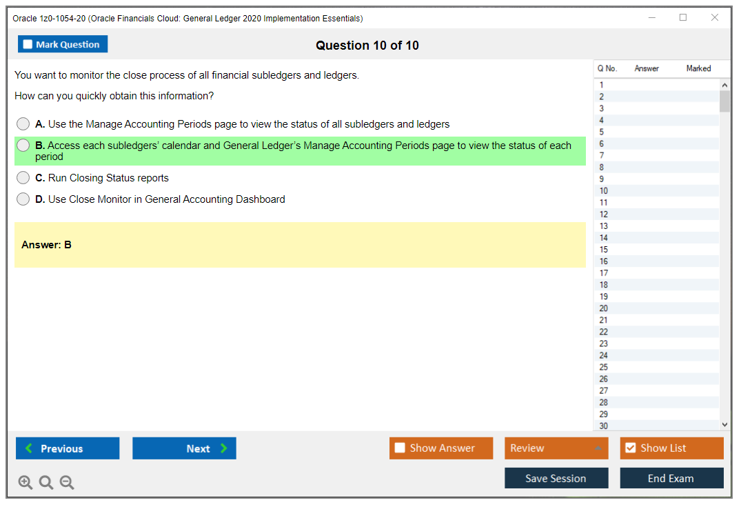 Il n'a jamais été aussi facile de se frayer un chemin vers la qualification professionnelle la plus précieuse au monde que maintenant ! Les questions-réponses de DumpsArena pour Oracle 1z0-1054-20 Oracle Financials Cloud: General Ledger 2020 Implementation Essentials sont le choix le plus approprié pour garantir votre succès en une seule fois. Vous pouvez certainement répondre à toutes les questions de l'examen en faisant régulièrement nos fichiers d'examen Oracle 1z0-1054-20. De plus, en affinant vos compétences, pratiquez des tests de simulation à l'aide de notre logiciel Testing Engine de DumpsArena pour Oracle 1z0-1054-20 et maîtrisez votre peur de l'échec à l'examen. Nos fichiers de Oracle 1z0-1054-20 sont les plus précis, fiables et efficaces pour déterminer la meilleure option pour votre temps et votre argent.