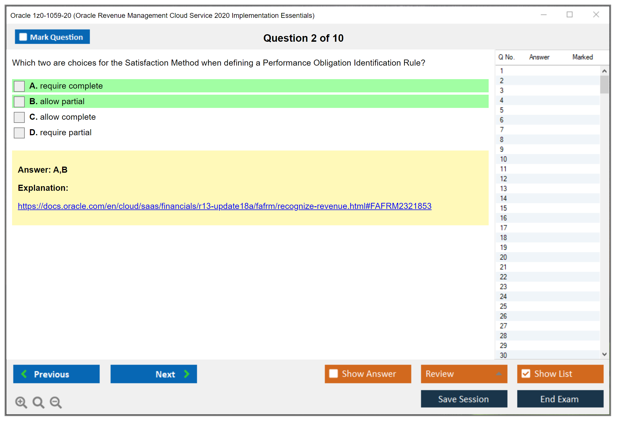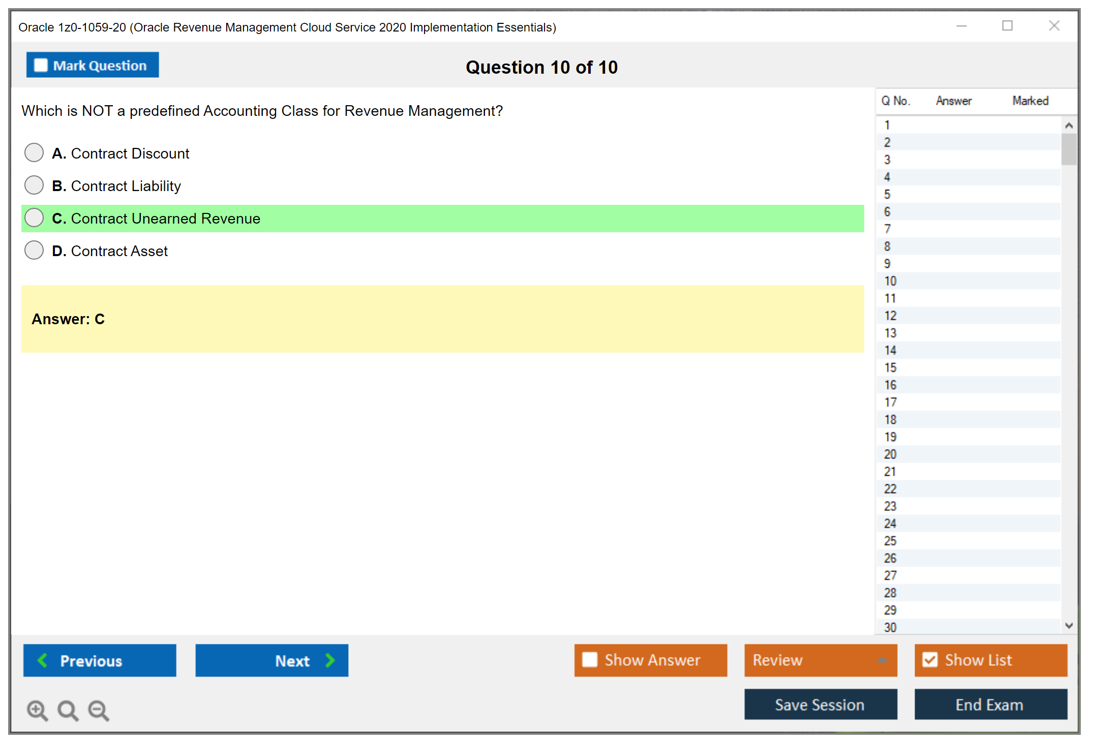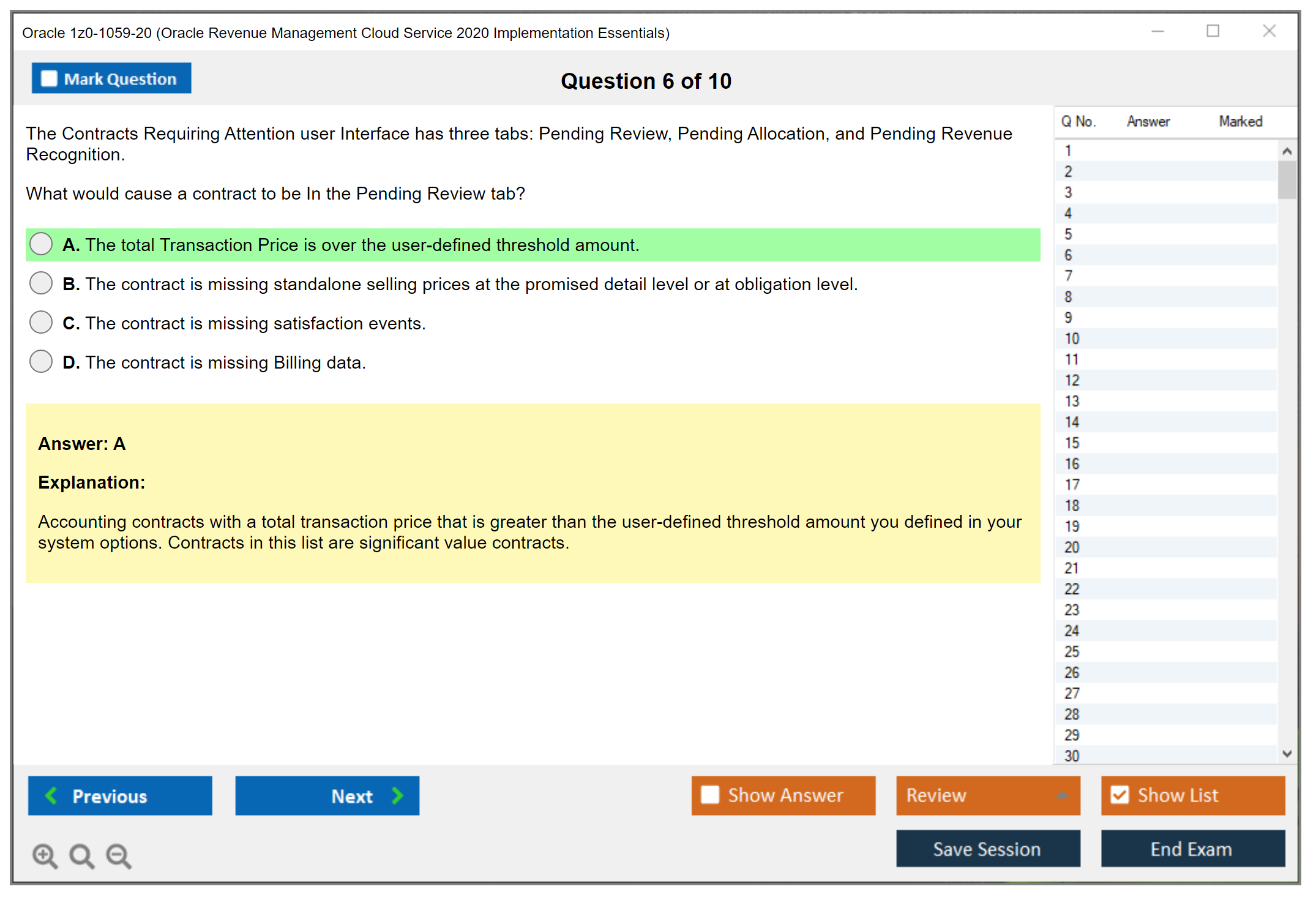 C'est maintenant aussi facile que de se promener dans un parc ! Utilisez uniquement les questions-réponses faciles de DumpsArena pour 1z0-1059-20 Oracle Revenue Management Cloud Service 2020 Implementation Essentials qui peuvent vous garantir un succès dès la première fois, avec une garantie de remboursement à 100 % ! Des milliers de professionnels de l'informatique ont déjà utilisé ces questions-réponses 1z0-1059-20 et ont obtenu leur certification de rêve dès la première tentative.