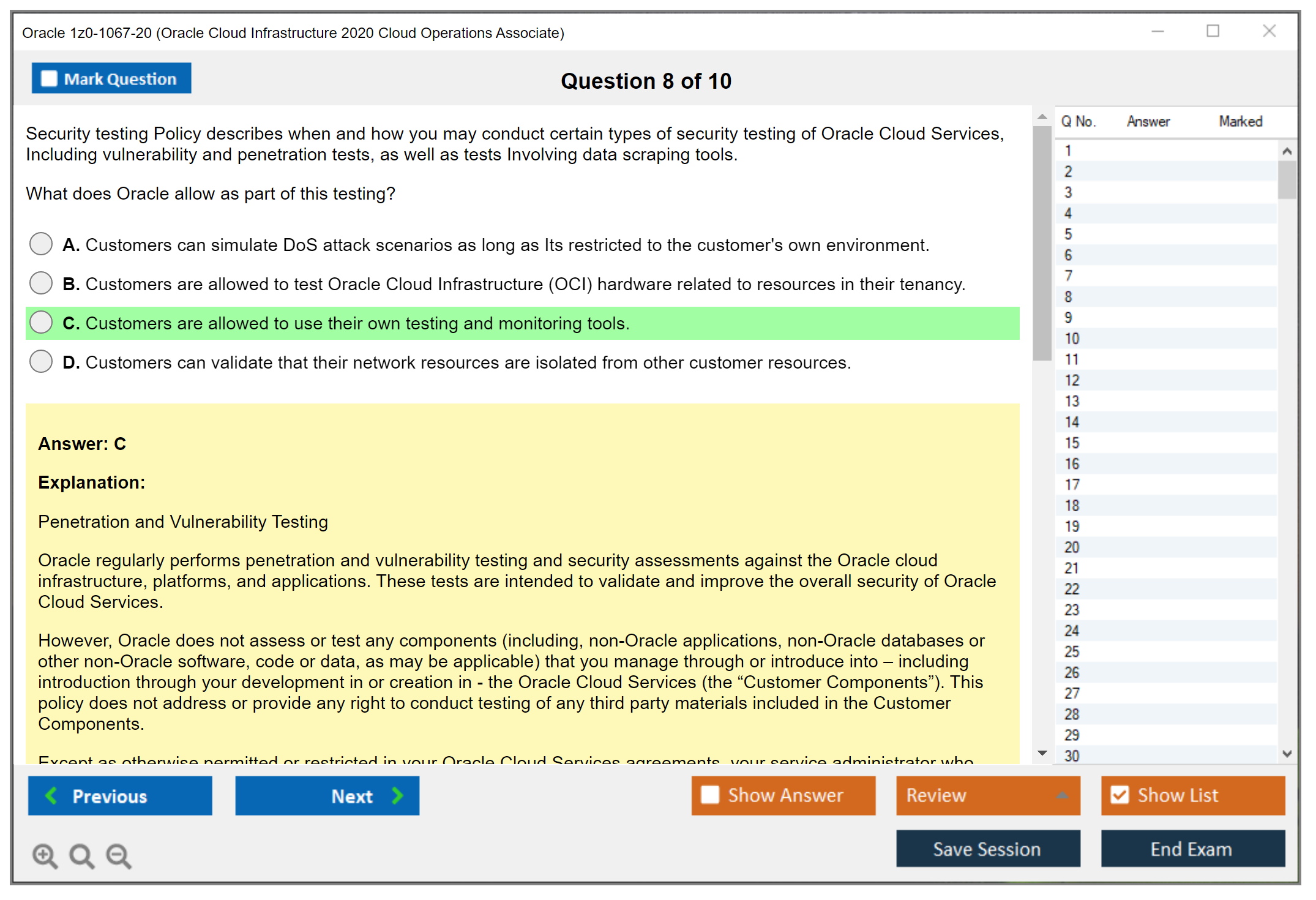 Les examens standards sont importants si vous n'avez jamais passé un examen paramétrique ou VUE auparavant. La précision des questions et des réponses est entièrement garantie par nos experts certifiés et leur nombre est suffisant pour influencer la réussite de l'examen. DumpsArena.co propose 90 jours de mises à jour gratuites. Ceci est important si vous passez un test qui est fréquemment mis à jour. Le matériel d'étude de DumpsArena.co pour Oracle 1z0-1067-20 a été vérifié par des experts de Oracle.