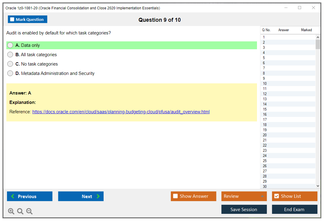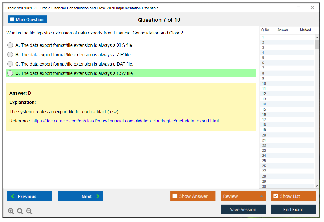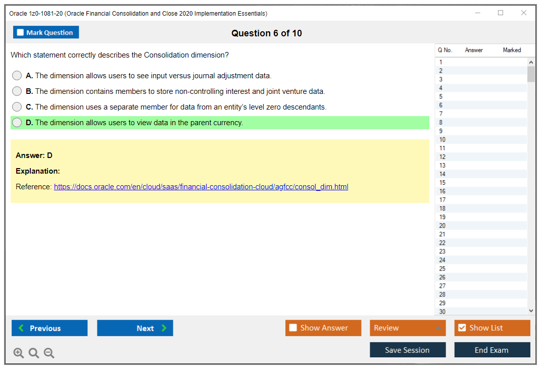 Les fichiers d'examen DumpsArena pour 1z0-1081-20 Oracle Financial Consolidation and Close 2020 Implementation Essentials sont très efficaces. Ils se concentrent entièrement sur les éléments les plus importants de votre examen et vous fournissent les informations les plus efficaces possibles dans un langage interactif et facile à comprendre. Envisagez d'améliorer votre carrière avec cette formule de réussite d'examen testée et authentique. Les fichiers de questions 1z0-1081-20 sont uniques et constituent une opportunité pour chaque professionnel de l'informatique aspirant à passer un examen 1z0-1081-20 malgré les contraintes de temps. Il y a de fortes chances que la plupart de ces questions se retrouvent dans votre examen 1z0-1081-20 réel.