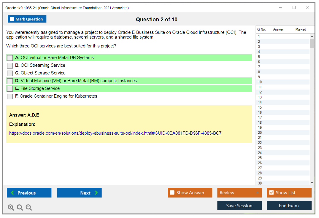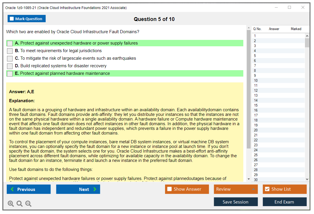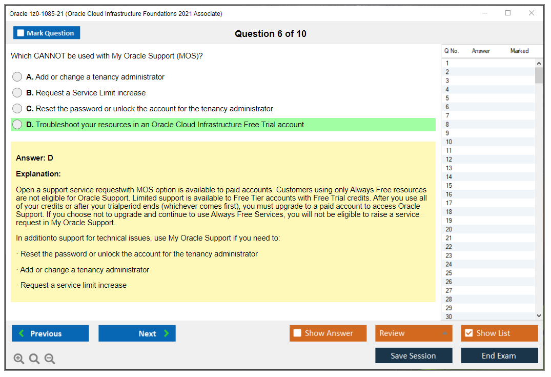 Les examens standards sont importants si vous n'avez jamais passé un examen paramétrique ou VUE auparavant. La précision des questions et des réponses est entièrement garantie par nos experts certifiés et leur nombre est suffisant pour influencer la réussite de l'examen. DumpsArena.co propose 90 jours de mises à jour gratuites. Ceci est important si vous passez un test qui est fréquemment mis à jour. Le matériel d'étude de DumpsArena.co pour Oracle 1z0-1085-21 a été vérifié par des experts de Oracle.