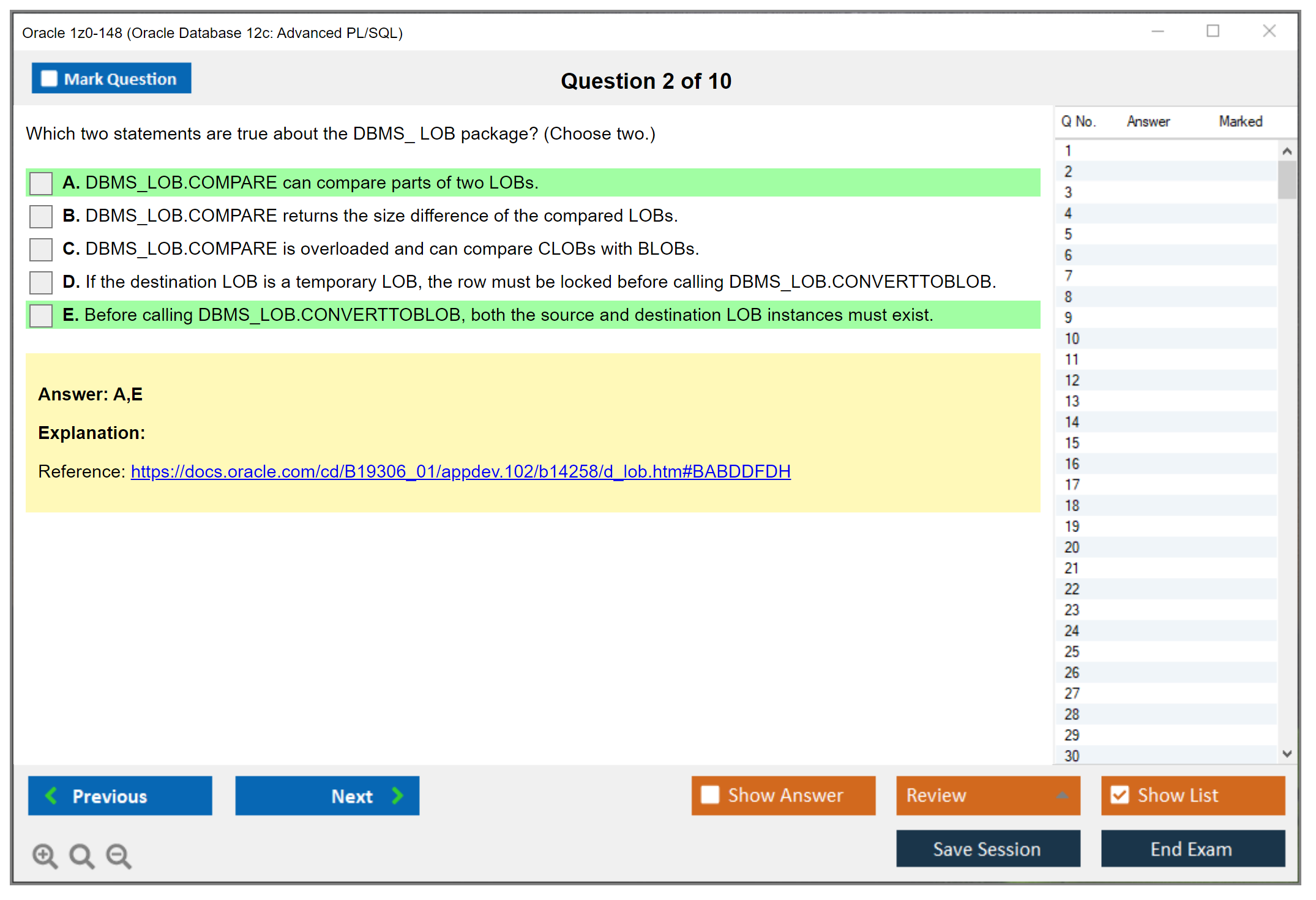 Les fichiers d'examen DumpsArena pour 1z0-148 Oracle Database 12c: Advanced PL/SQL sont très efficaces. Ils se concentrent entièrement sur les éléments les plus importants de votre examen et vous fournissent les informations les plus efficaces possibles dans un langage interactif et facile à comprendre. Envisagez d'améliorer votre carrière avec cette formule de réussite d'examen testée et authentique. Les fichiers de questions 1z0-148 sont uniques et constituent une opportunité pour chaque professionnel de l'informatique aspirant à passer un examen 1z0-148 malgré les contraintes de temps. Il y a de fortes chances que la plupart de ces questions se retrouvent dans votre examen 1z0-148 réel.