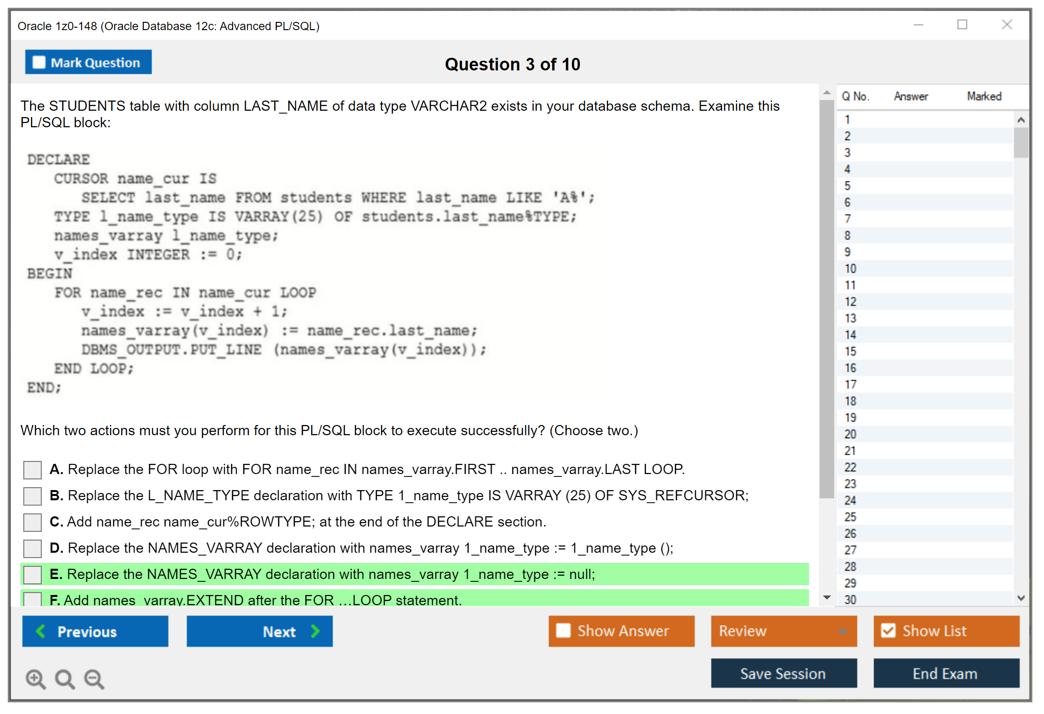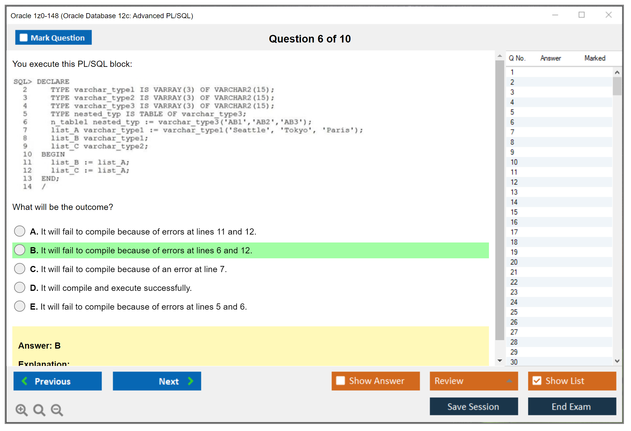 Il n'a jamais été aussi facile de se frayer un chemin vers la qualification professionnelle la plus précieuse au monde que maintenant ! Les questions-réponses de DumpsArena pour Oracle 1z0-148 Oracle Database 12c: Advanced PL/SQL sont le choix le plus approprié pour garantir votre succès en une seule fois. Vous pouvez certainement répondre à toutes les questions de l'examen en faisant régulièrement nos fichiers d'examen Oracle 1z0-148. De plus, en affinant vos compétences, pratiquez des tests de simulation à l'aide de notre logiciel Testing Engine de DumpsArena pour Oracle 1z0-148 et maîtrisez votre peur de l'échec à l'examen. Nos fichiers de Oracle 1z0-148 sont les plus précis, fiables et efficaces pour déterminer la meilleure option pour votre temps et votre argent.