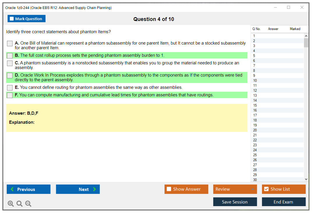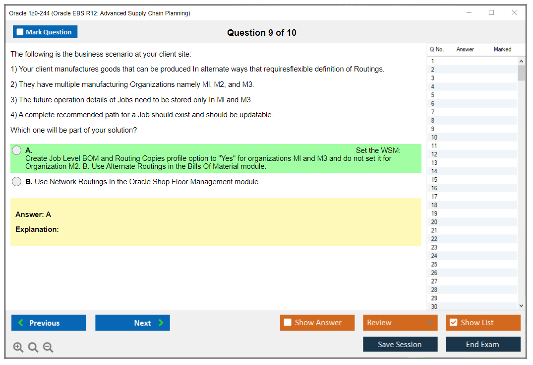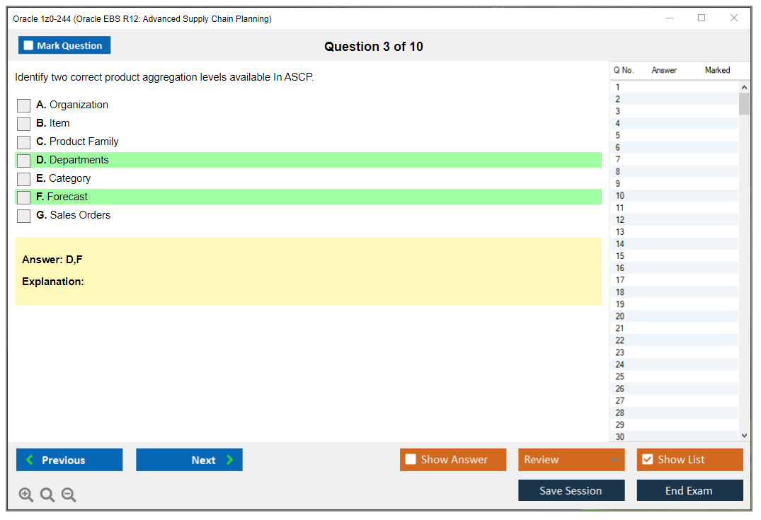 C'est maintenant aussi facile que de se promener dans un parc ! Utilisez uniquement les questions-réponses faciles de DumpsArena pour 1z0-244 Oracle EBS R12: Advanced Supply Chain Planning qui peuvent vous garantir un succès dès la première fois, avec une garantie de remboursement à 100 % ! Des milliers de professionnels de l'informatique ont déjà utilisé ces questions-réponses 1z0-244 et ont obtenu leur certification de rêve dès la première tentative.