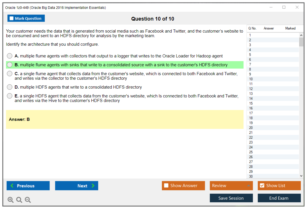 Il n'a jamais été aussi facile de se frayer un chemin vers la qualification professionnelle la plus précieuse au monde que maintenant ! Les questions-réponses de DumpsArena pour Oracle 1z0-449 Oracle Big Data 2016 Implementation Essentials sont le choix le plus approprié pour garantir votre succès en une seule fois. Vous pouvez certainement répondre à toutes les questions de l'examen en faisant régulièrement nos fichiers d'examen Oracle 1z0-449. De plus, en affinant vos compétences, pratiquez des tests de simulation à l'aide de notre logiciel Testing Engine de DumpsArena pour Oracle 1z0-449 et maîtrisez votre peur de l'échec à l'examen. Nos fichiers de Oracle 1z0-449 sont les plus précis, fiables et efficaces pour déterminer la meilleure option pour votre temps et votre argent.