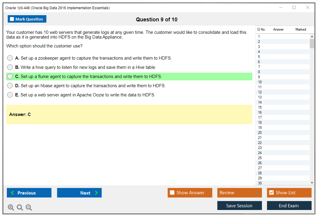C'est maintenant aussi facile que de se promener dans un parc ! Utilisez uniquement les questions-réponses faciles de DumpsArena pour 1z0-449 Oracle Big Data 2016 Implementation Essentials qui peuvent vous garantir un succès dès la première fois, avec une garantie de remboursement à 100 % ! Des milliers de professionnels de l'informatique ont déjà utilisé ces questions-réponses 1z0-449 et ont obtenu leur certification de rêve dès la première tentative.