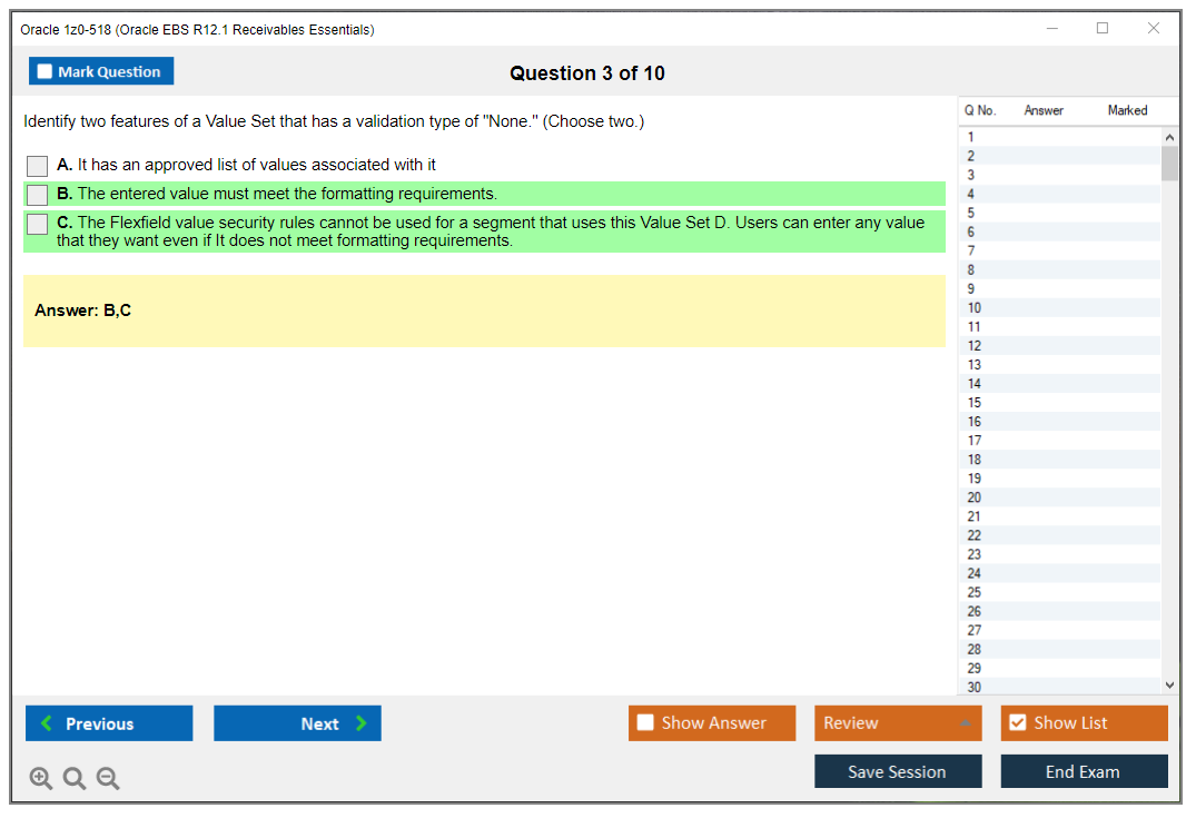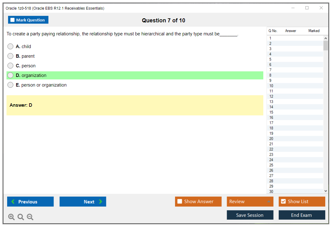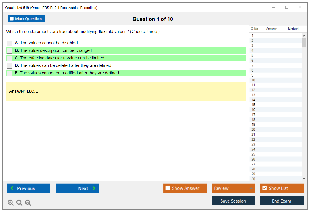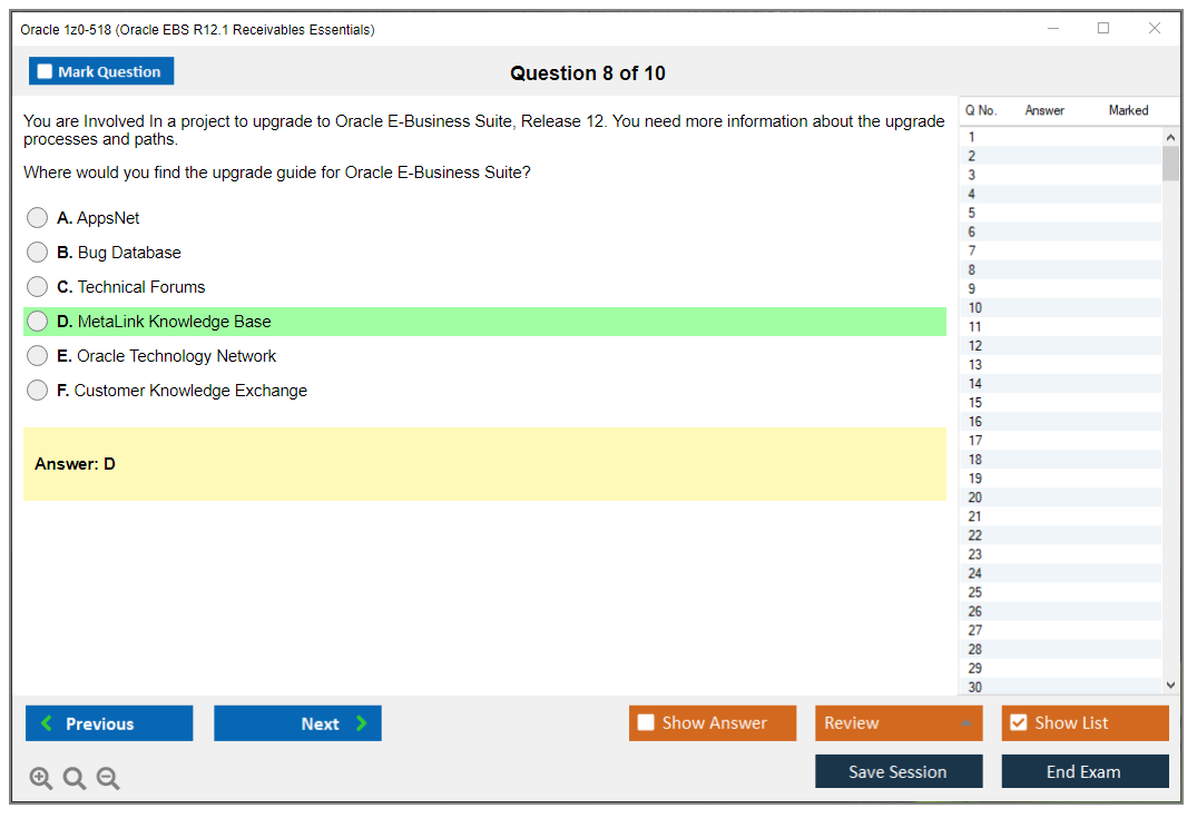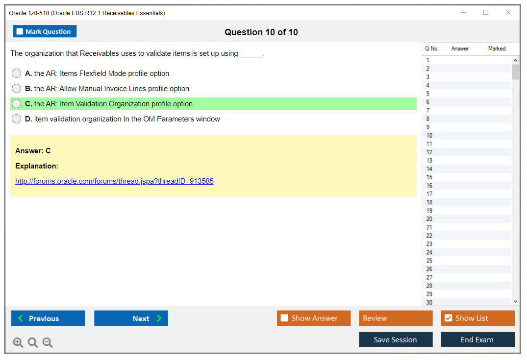 Les fichiers d'examen DumpsArena pour 1z0-518 Oracle EBS R12.1 Receivables Essentials sont très efficaces. Ils se concentrent entièrement sur les éléments les plus importants de votre examen et vous fournissent les informations les plus efficaces possibles dans un langage interactif et facile à comprendre. Envisagez d'améliorer votre carrière avec cette formule de réussite d'examen testée et authentique. Les fichiers de questions 1z0-518 sont uniques et constituent une opportunité pour chaque professionnel de l'informatique aspirant à passer un examen 1z0-518 malgré les contraintes de temps. Il y a de fortes chances que la plupart de ces questions se retrouvent dans votre examen 1z0-518 réel.