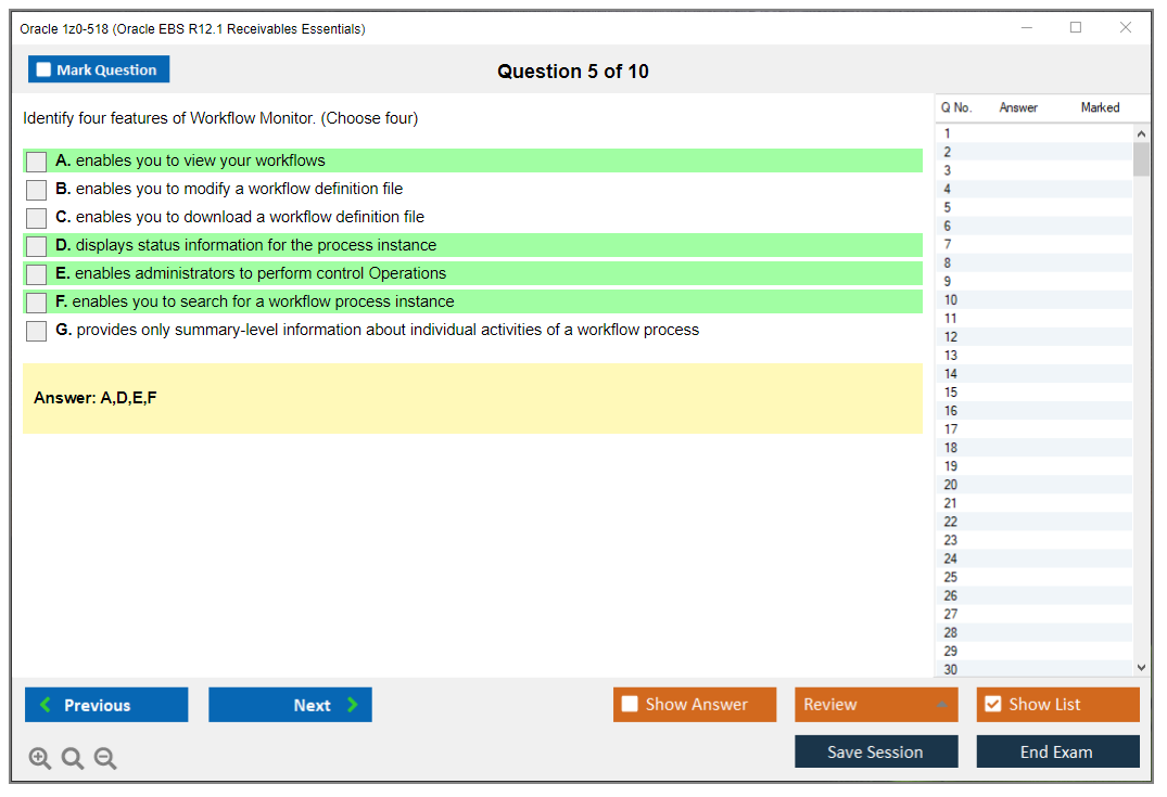 Les examens standards sont importants si vous n'avez jamais passé un examen paramétrique ou VUE auparavant. La précision des questions et des réponses est entièrement garantie par nos experts certifiés et leur nombre est suffisant pour influencer la réussite de l'examen. DumpsArena.co propose 90 jours de mises à jour gratuites. Ceci est important si vous passez un test qui est fréquemment mis à jour. Le matériel d'étude de DumpsArena.co pour Oracle 1z0-518 a été vérifié par des experts de Oracle.