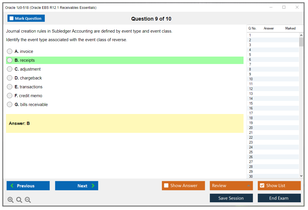 C'est maintenant aussi facile que de se promener dans un parc ! Utilisez uniquement les questions-réponses faciles de DumpsArena pour 1z0-518 Oracle EBS R12.1 Receivables Essentials qui peuvent vous garantir un succès dès la première fois, avec une garantie de remboursement à 100 % ! Des milliers de professionnels de l'informatique ont déjà utilisé ces questions-réponses 1z0-518 et ont obtenu leur certification de rêve dès la première tentative.