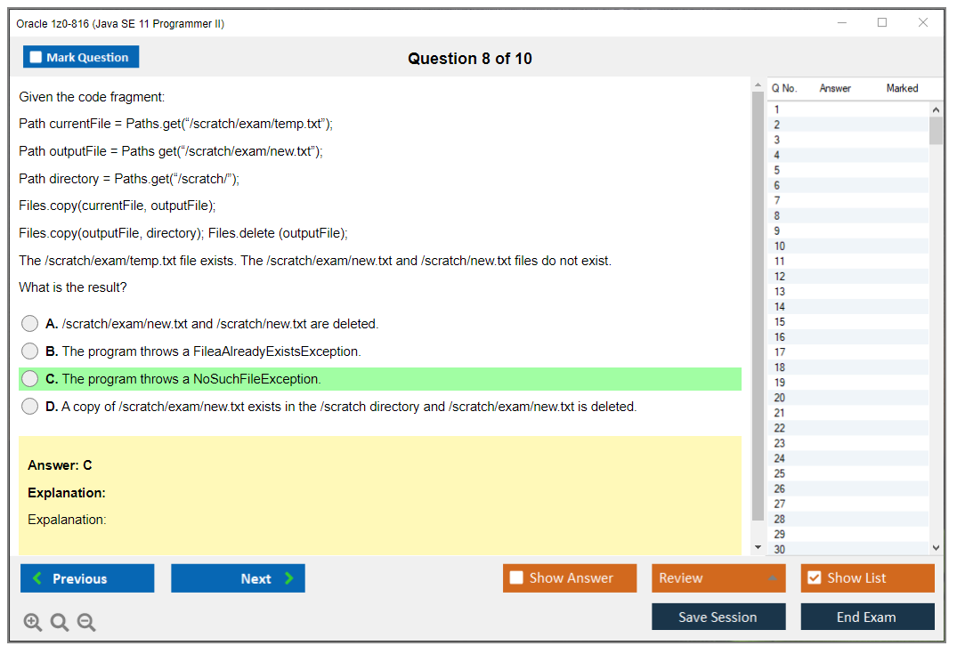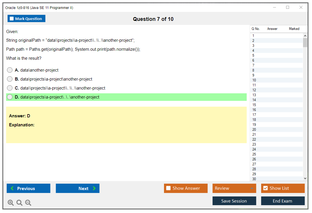 Il n'a jamais été aussi facile de se frayer un chemin vers la qualification professionnelle la plus précieuse au monde que maintenant ! Les questions-réponses de DumpsArena pour Oracle 1z0-816 Java SE 11 Programmer II sont le choix le plus approprié pour garantir votre succès en une seule fois. Vous pouvez certainement répondre à toutes les questions de l'examen en faisant régulièrement nos fichiers d'examen Oracle 1z0-816. De plus, en affinant vos compétences, pratiquez des tests de simulation à l'aide de notre logiciel Testing Engine de DumpsArena pour Oracle 1z0-816 et maîtrisez votre peur de l'échec à l'examen. Nos fichiers de Oracle 1z0-816 sont les plus précis, fiables et efficaces pour déterminer la meilleure option pour votre temps et votre argent.