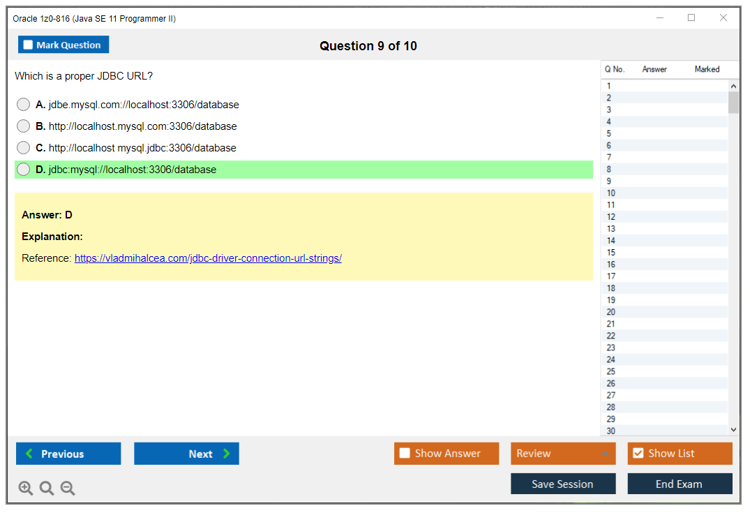 Les examens standards sont importants si vous n'avez jamais passé un examen paramétrique ou VUE auparavant. La précision des questions et des réponses est entièrement garantie par nos experts certifiés et leur nombre est suffisant pour influencer la réussite de l'examen. DumpsArena.co propose 90 jours de mises à jour gratuites. Ceci est important si vous passez un test qui est fréquemment mis à jour. Le matériel d'étude de DumpsArena.co pour Oracle 1z0-816 a été vérifié par des experts de Oracle.