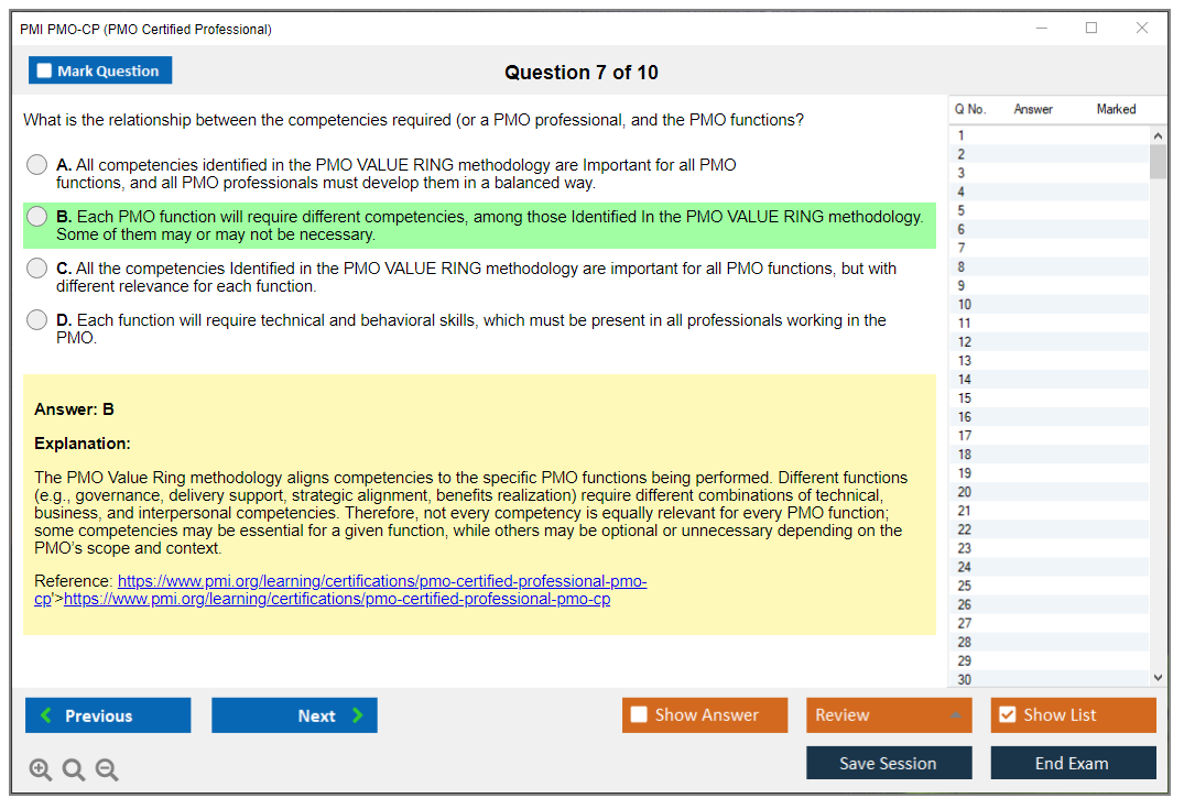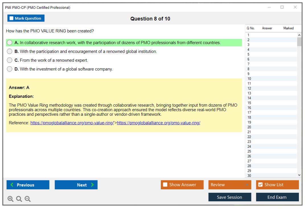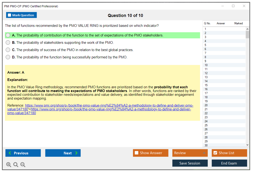 Les examens standards sont importants si vous n'avez jamais passé un examen paramétrique ou VUE auparavant. La précision des questions et des réponses est entièrement garantie par nos experts certifiés et leur nombre est suffisant pour influencer la réussite de l'examen. DumpsArena.co propose 90 jours de mises à jour gratuites. Ceci est important si vous passez un test qui est fréquemment mis à jour. Le matériel d'étude de DumpsArena.co pour PMI PMO-CP a été vérifié par des experts de PMI.