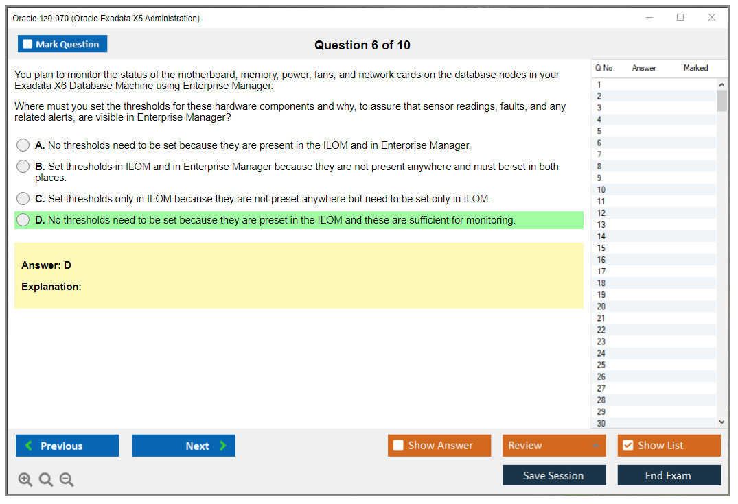 C'est maintenant aussi simple que de se promener dans un parc ! Utilisez simplement les Questions et Réponses faciles de DumpsArena pour 1z0-070 Oracle Exadata X5 Administration qui peuvent vous garantir le succès dès la première tentative avec une garantie de remboursement à 100 % ! Des milliers de professionnels de l'informatique ont déjà utilisé ces Q&R pour le 1z0-070 avec un taux de réussite de 100 % dès la première tentative et ont obtenu leur certification de rêve.
