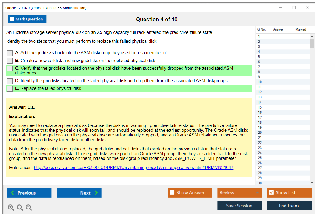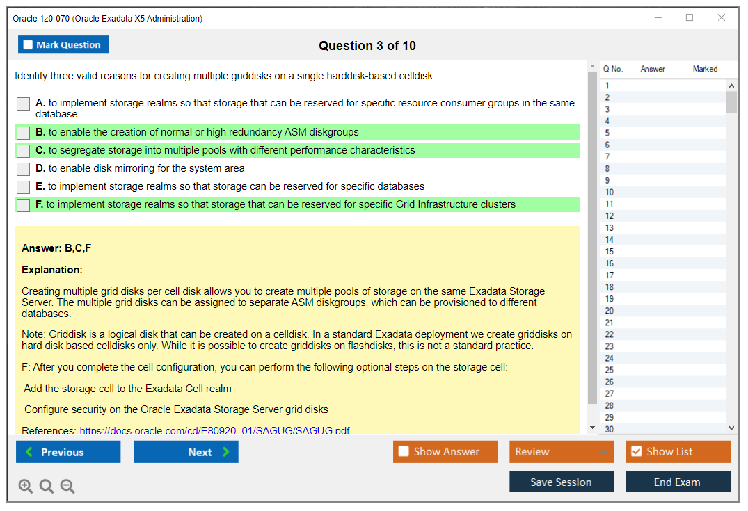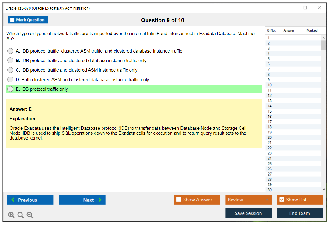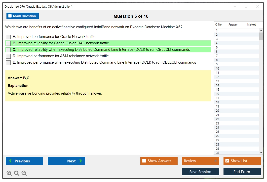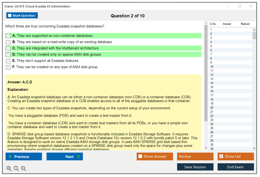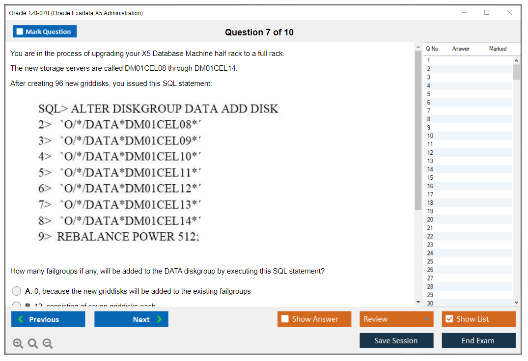 Les Q&R de l'examen 1z0-070 Oracle Exadata X5 Administration de DumpsArena sont très efficaces. Elles se concentrent entièrement sur les éléments les plus importants de votre examen et vous fournissent les informations les plus efficaces dans un langage interactif et facile à comprendre. Envisagez de stimuler votre carrière avec cette formule d'examen testée et la plus authentique. Les Q&R de l'examen 1z0-070 sont uniques et un atout pour chaque professionnel de l'informatique aspirant qui souhaite passer un examen 1z0-070 malgré ses contraintes de temps. Il y a de fortes chances que la plupart de ces questions se retrouvent dans votre véritable examen 1z0-070.