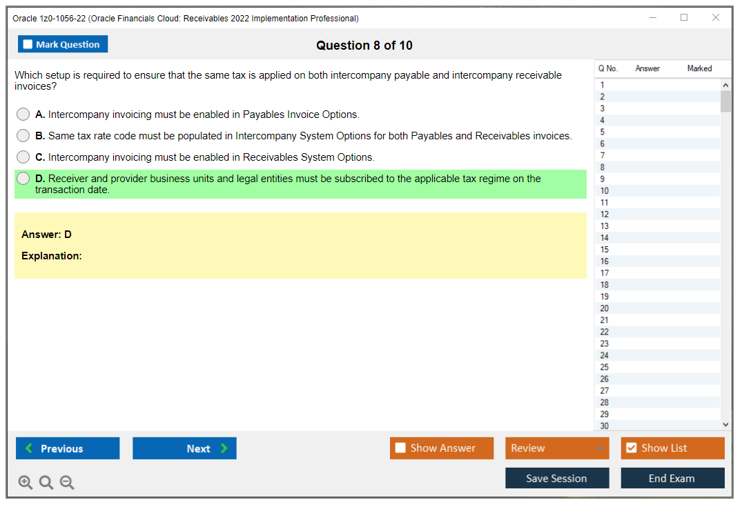 Les Q&R de l'examen 1z0-1056-22 Oracle Financials Cloud: Receivables 2022 Implementation Professional de DumpsArena sont très efficaces. Elles se concentrent entièrement sur les éléments les plus importants de votre examen et vous fournissent les informations les plus efficaces dans un langage interactif et facile à comprendre. Envisagez de stimuler votre carrière avec cette formule d'examen testée et la plus authentique. Les Q&R de l'examen 1z0-1056-22 sont uniques et un atout pour chaque professionnel de l'informatique aspirant qui souhaite passer un examen 1z0-1056-22 malgré ses contraintes de temps. Il y a de fortes chances que la plupart de ces questions se retrouvent dans votre véritable examen 1z0-1056-22.