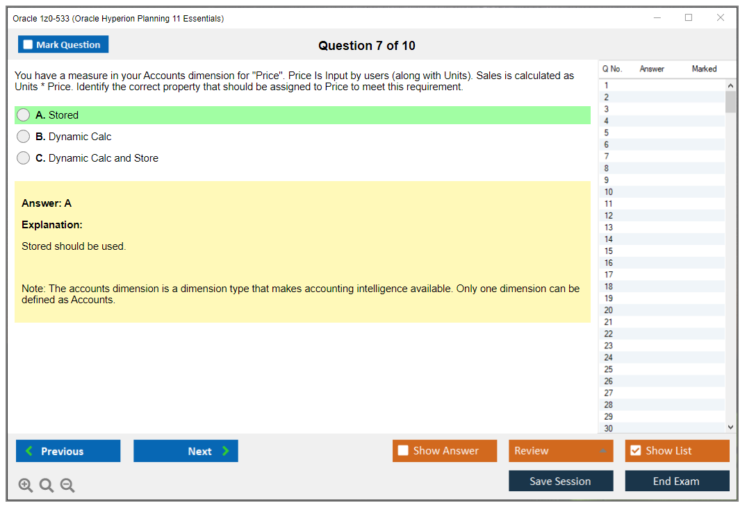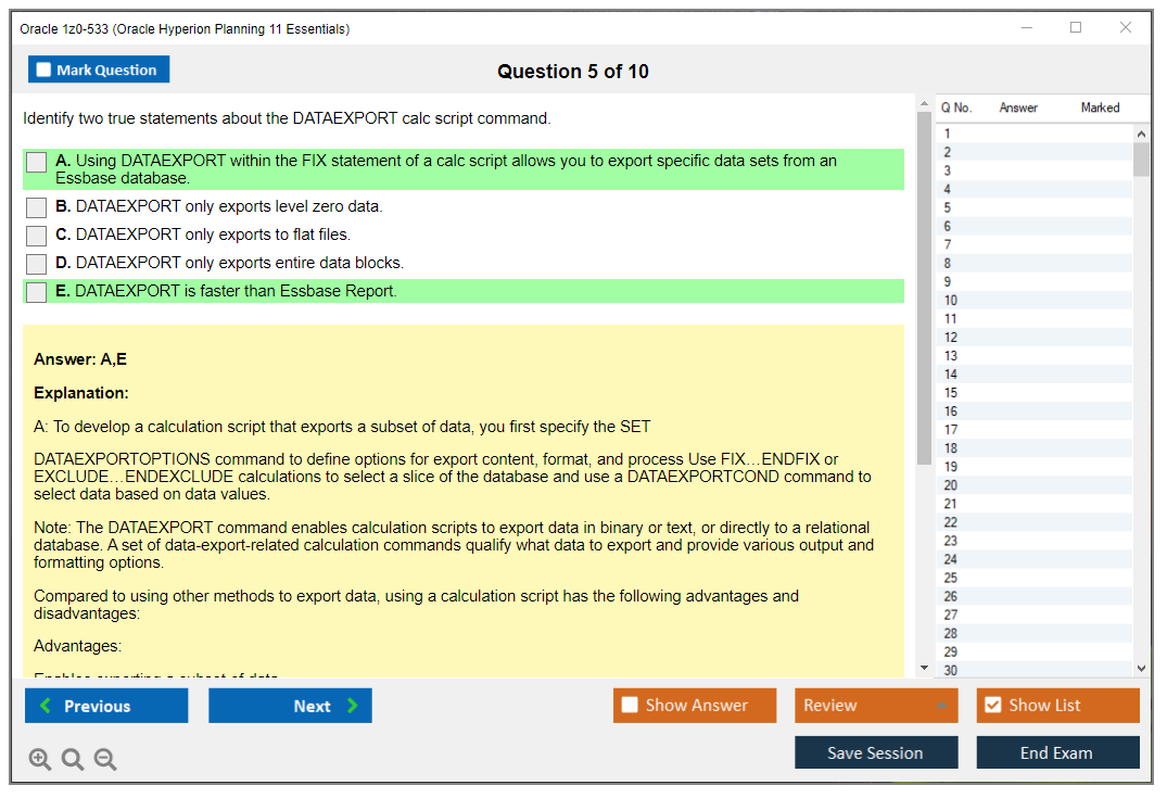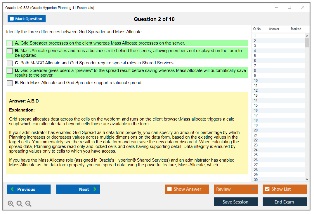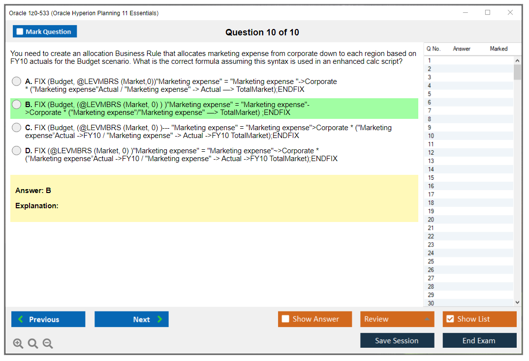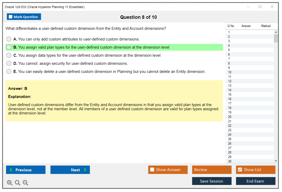Il n'a jamais été aussi facile de décrocher la qualification professionnelle la plus précieuse au monde que cela ne l'est devenu maintenant ! Les questions-réponses de formation Oracle 1z0-533 Oracle Hyperion Planning 11 Essentials de DumpsArena sont le choix le plus adapté pour garantir votre réussite en une seule fois. Vous pouvez certainement répondre à toutes les questions de l'examen en utilisant fréquemment nos dumps Oracle 1z0-533. De plus, en perfectionnant vos compétences, pratiquez des tests simulés en utilisant notre logiciel de moteur de test Oracle 1z0-533 de DumpsArena et maîtrisez votre peur d'échouer à l'examen. Nos dumps Oracle 1z0-533 sont le matériel d'étude le plus précis, fiable et efficace qui déterminera la meilleure option pour votre temps et votre argent.