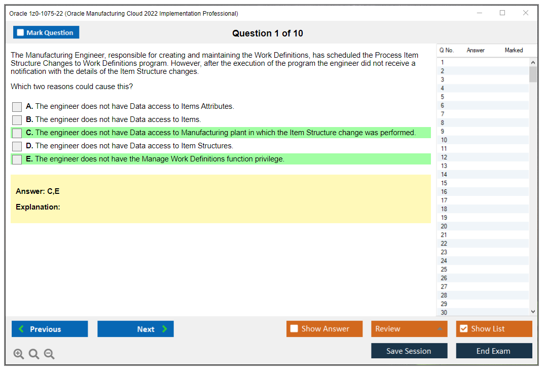 I dump di 1z0-1075-22 Oracle Manufacturing Cloud 2022 Implementation Professional di DumpsArena sono abbastanza efficaci. Si concentrano completamente sugli elementi più importanti del tuo esame e ti forniscono le informazioni più efficienti in un linguaggio interattivo e facile da capire. Considera di migliorare la tua carriera con questa formula di superamento dell'esame testata e autentica. I braindump di 1z0-1075-22 sono unici e una chicca per ogni aspirante professionista IT che desidera sostenere un esame 1z0-1075-22 nonostante i limiti di tempo. C'è una forte possibilità che molte di queste domande le troverai nel tuo vero esame 1z0-1075-22.