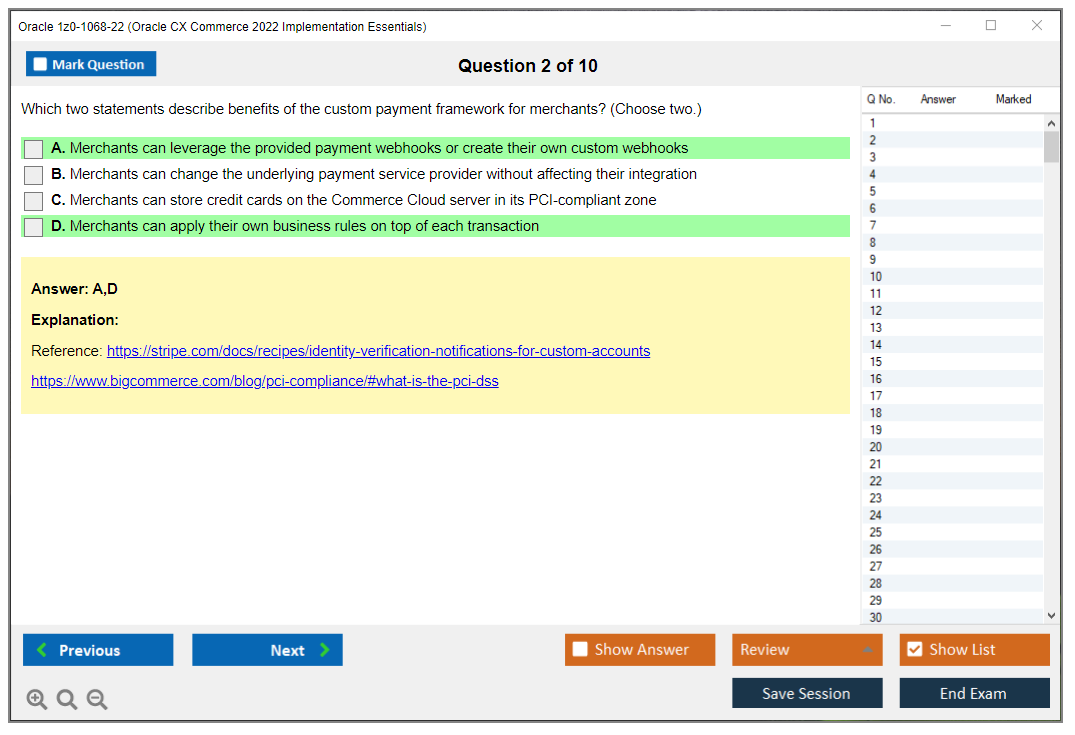Os dumps 1z0-1068-22 Oracle CX Commerce 2022 Implementation Essentials da DumpsArena são bastante eficazes. Eles se concentram inteiramente nos elementos mais importantes do seu exame e fornecem as informações mais eficientes possíveis em um idioma interativo e fácil de entender. Considere impulsionar sua carreira com esta fórmula de aprovação de exame testada e mais autêntica. Exames cerebrais 1z0-1068-22 são únicos e um tratamento para todo profissional de TI aspirante que deseja fazer um exame 1z0-1068-22, apesar das limitações de tempo. Há uma grande chance de que a maioria dessas perguntas esteja no seu verdadeiro exame 1z0-1068-22.