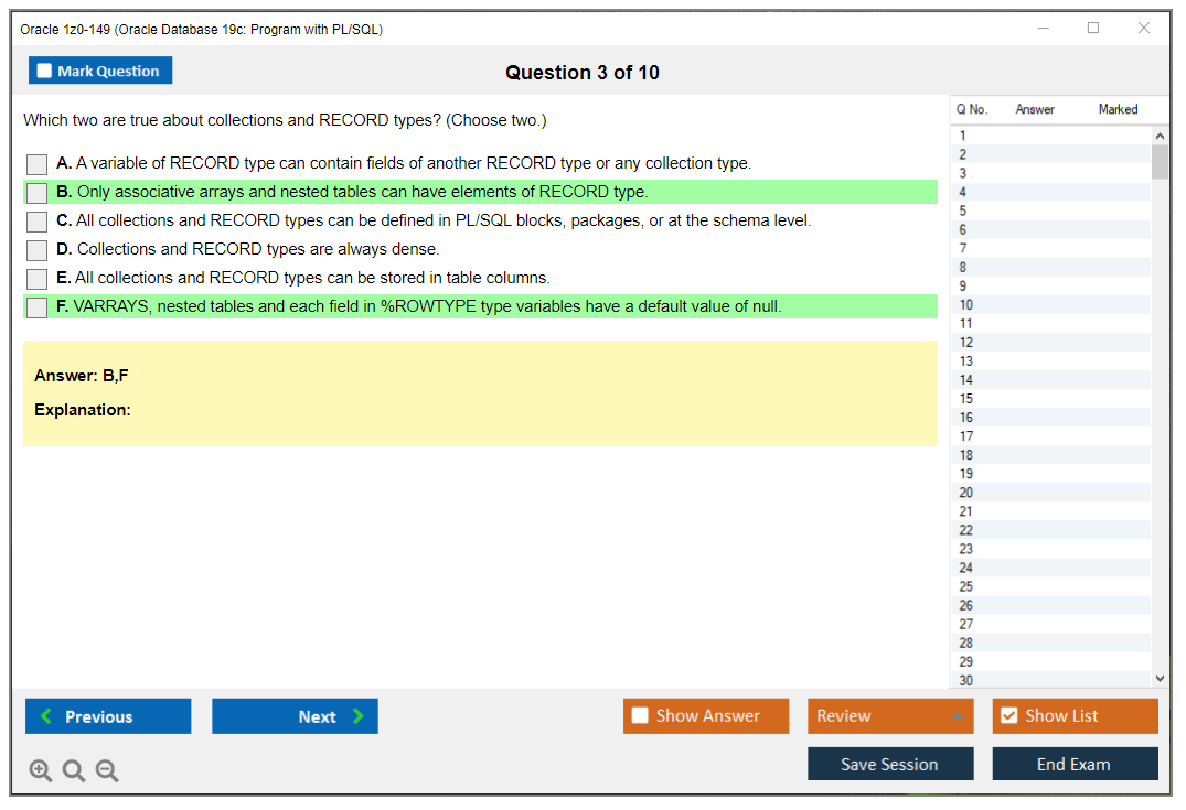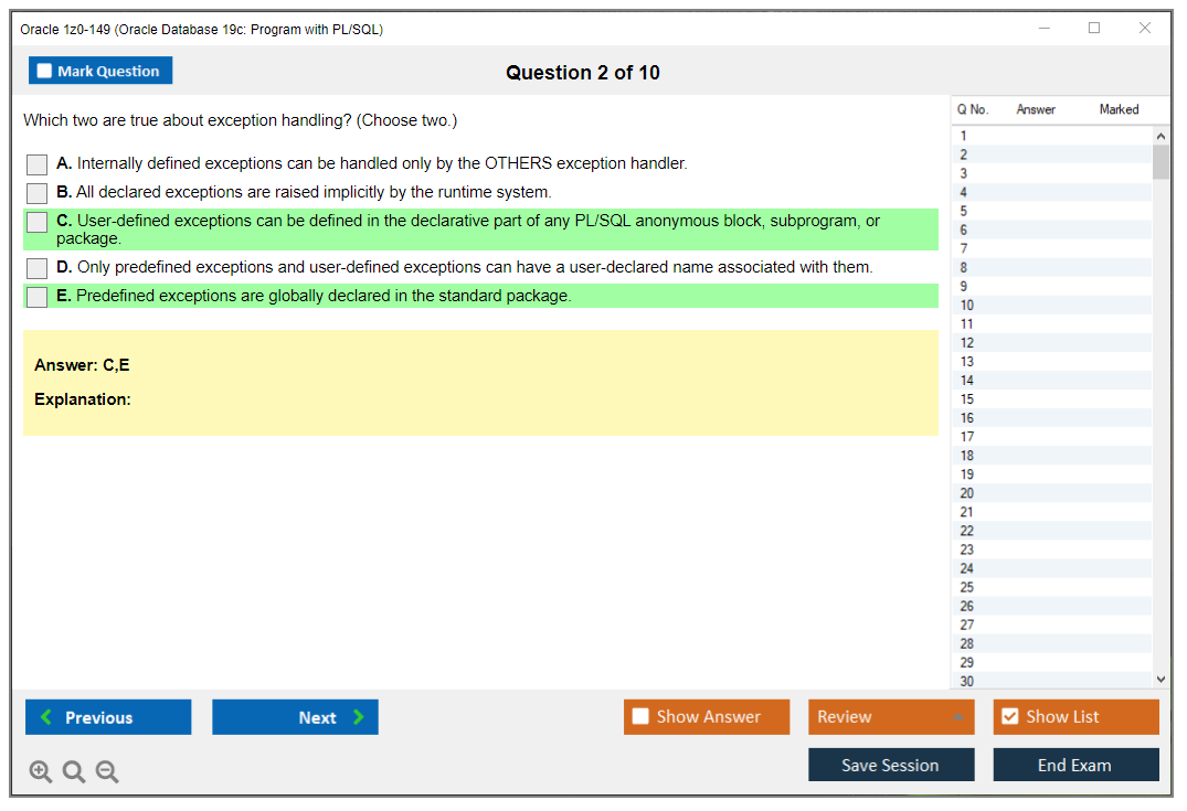 Os dumps 1z0-149 Oracle Database 19c: Program with PL/SQL da DumpsArena são bastante eficazes. Eles se concentram inteiramente nos elementos mais importantes do seu exame e fornecem as informações mais eficientes possíveis em um idioma interativo e fácil de entender. Considere impulsionar sua carreira com esta fórmula de aprovação de exame testada e mais autêntica. Exames cerebrais 1z0-149 são únicos e um tratamento para todo profissional de TI aspirante que deseja fazer um exame 1z0-149, apesar das limitações de tempo. Há uma grande chance de que a maioria dessas perguntas esteja no seu verdadeiro exame 1z0-149.