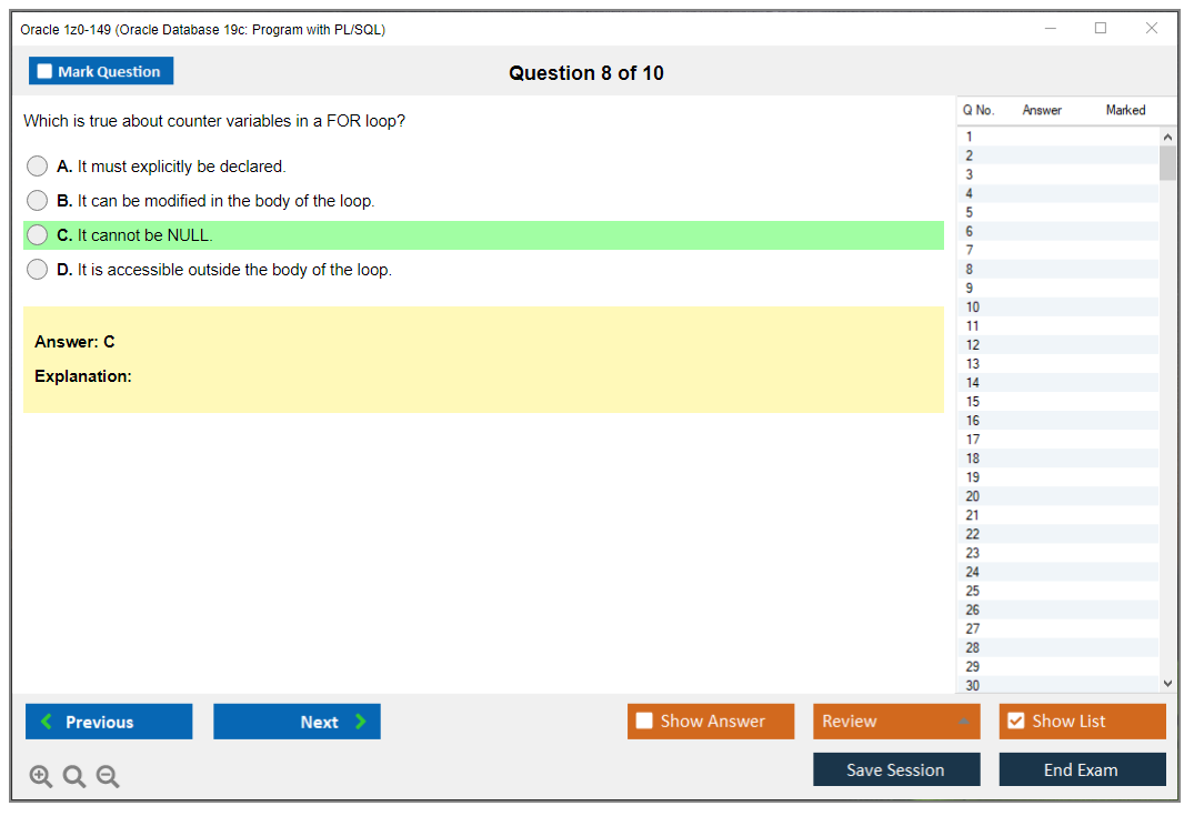 Nunca foi tão fácil chegar à qualificação profissional mais valiosa do mundo como agora! As perguntas e respostas do treinamento do Oracle 1z0-149 Oracle Database 19c: Program with PL/SQL da DumpsArena são a escolha mais adequada para garantir seu sucesso em apenas uma tentativa. Você certamente pode responder a todas as perguntas do exame fazendo nossos dumps do exame Oracle 1z0-149 com frequência. Além disso, aprimore suas habilidades, pratique testes simulados usando nosso software Testing Engine de braindumps Oracle 1z0-149 e supere o medo de reprovar no exame. Nossos dumps Oracle 1z0-149 são o material de estudo mais preciso, confiável e eficaz que determinará a melhor opção para seu tempo e dinheiro.
