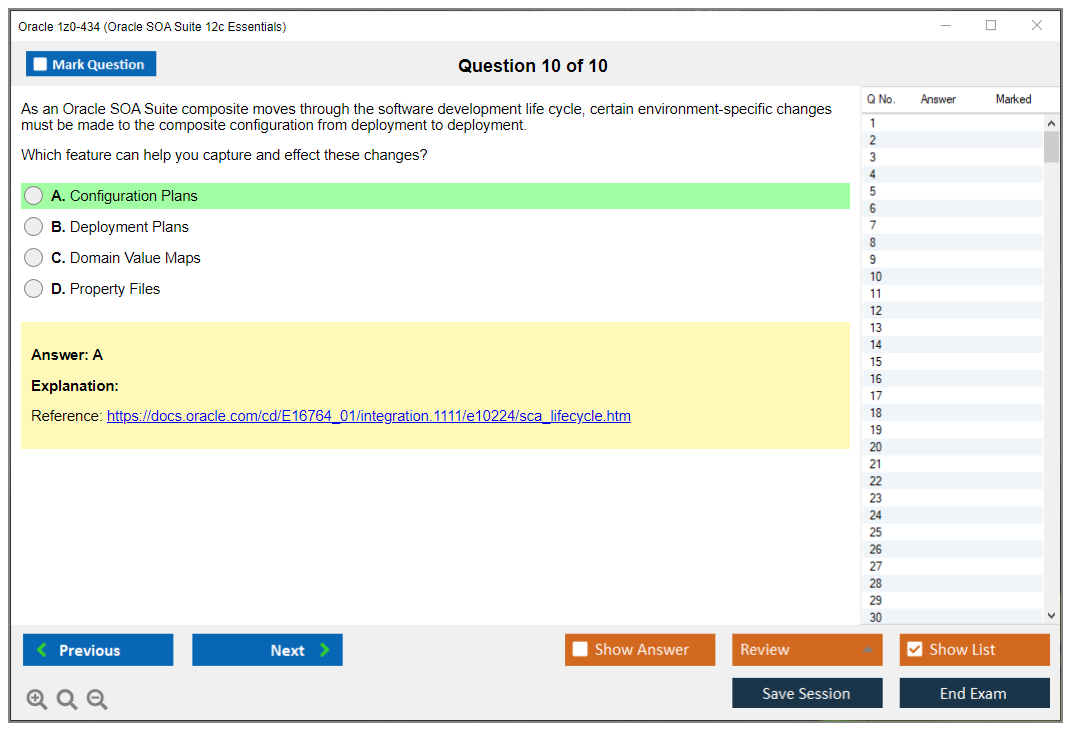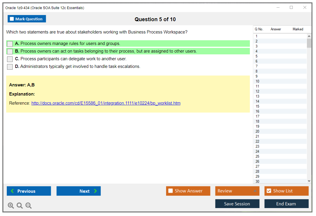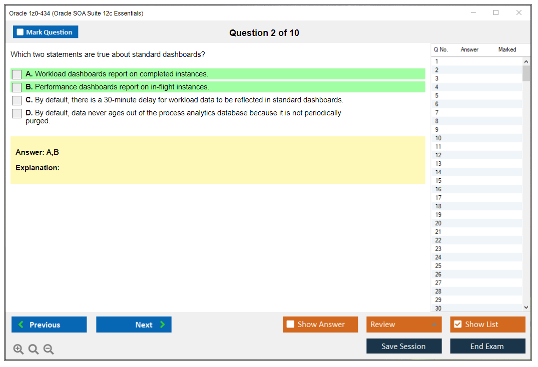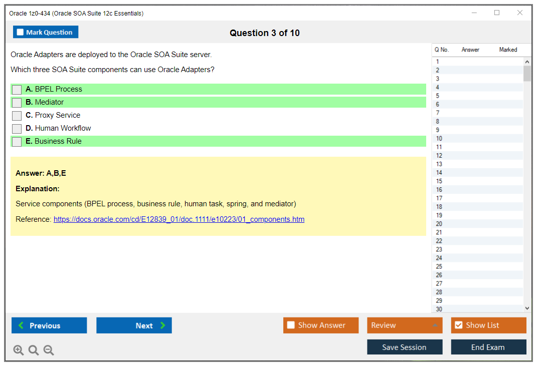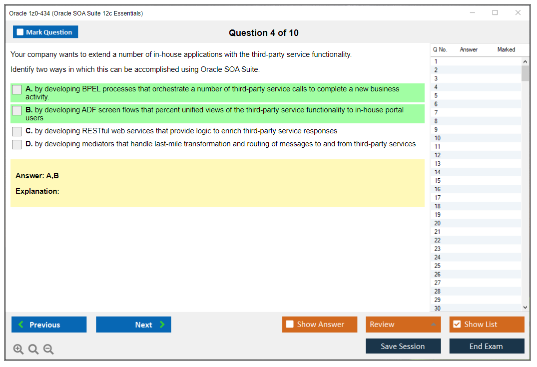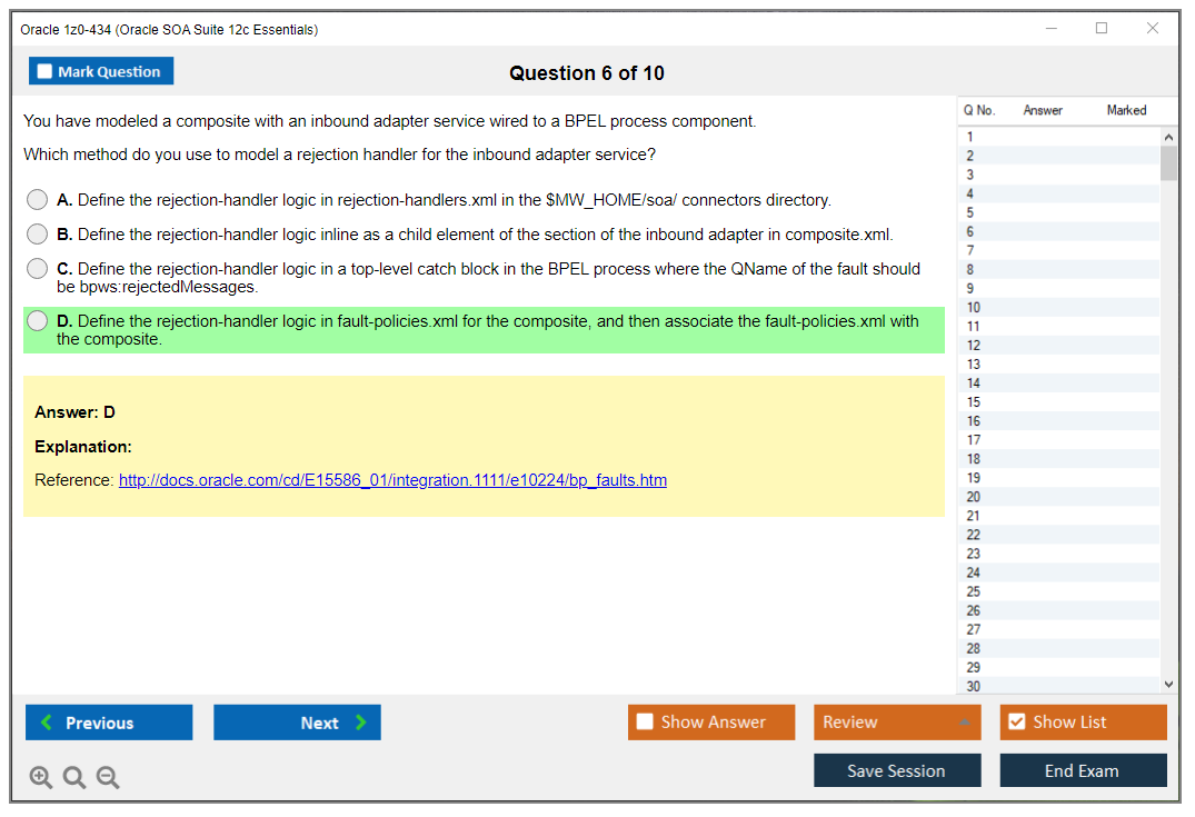 Os dumps 1z0-434 Oracle SOA Suite 12c Essentials da DumpsArena são bastante eficazes. Eles se concentram inteiramente nos elementos mais importantes do seu exame e fornecem as informações mais eficientes possíveis em um idioma interativo e fácil de entender. Considere impulsionar sua carreira com esta fórmula de aprovação de exame testada e mais autêntica. Exames cerebrais 1z0-434 são únicos e um tratamento para todo profissional de TI aspirante que deseja fazer um exame 1z0-434, apesar das limitações de tempo. Há uma grande chance de que a maioria dessas perguntas esteja no seu verdadeiro exame 1z0-434.