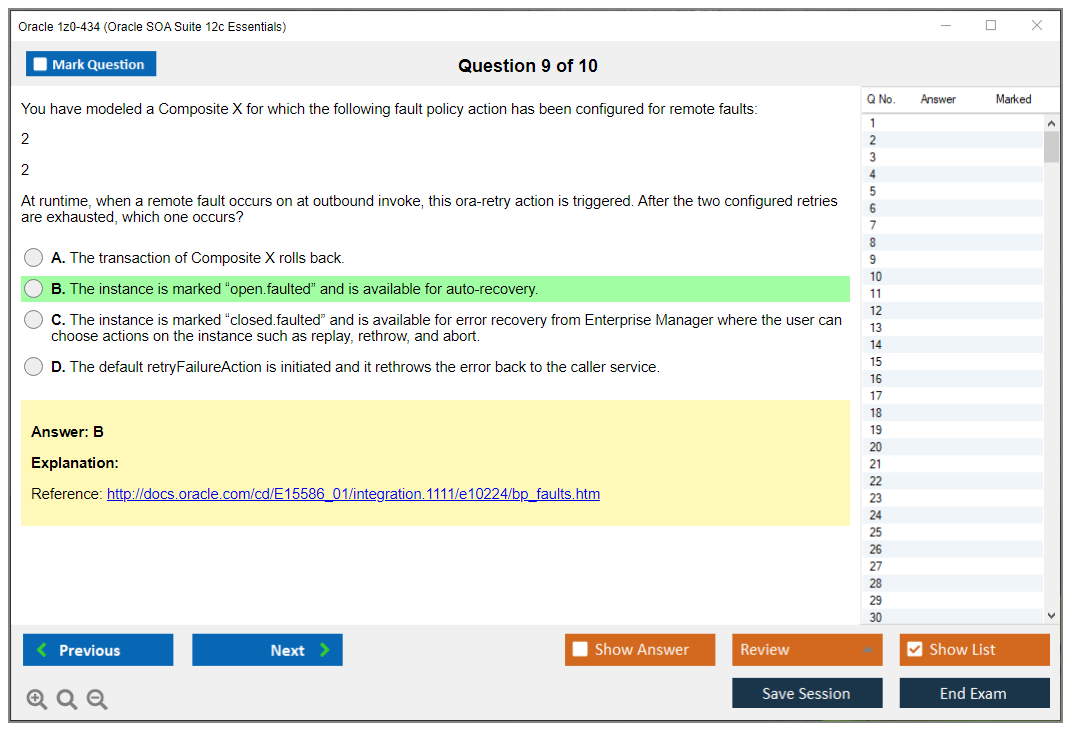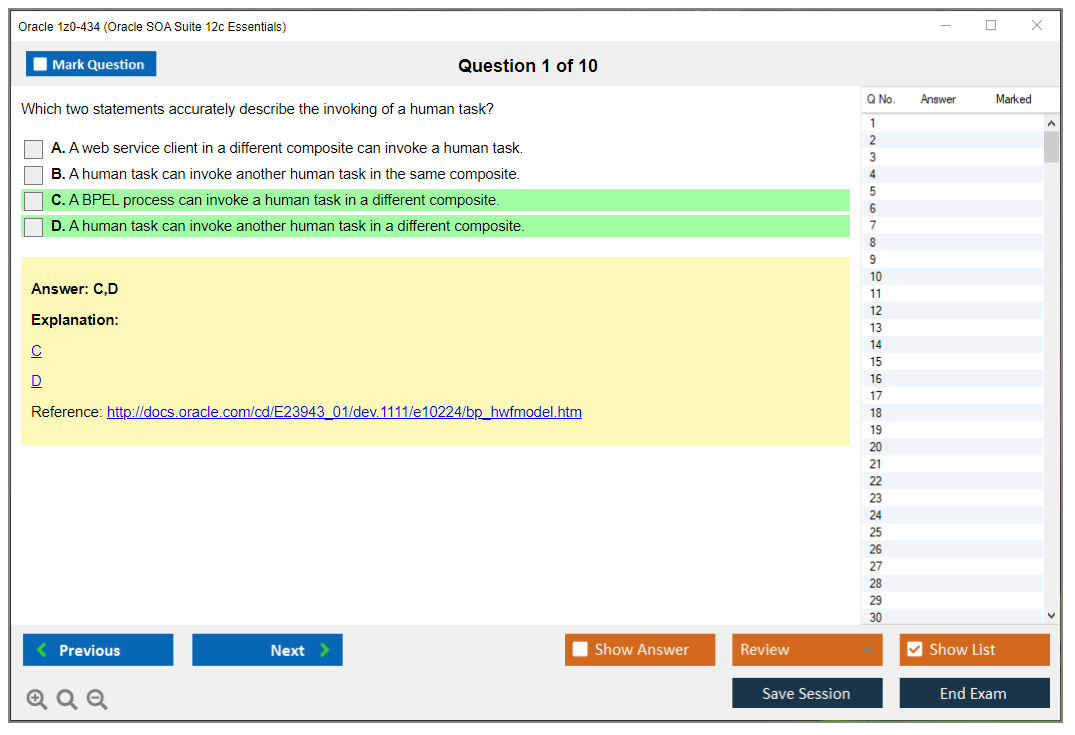 Nunca foi tão fácil chegar à qualificação profissional mais valiosa do mundo como agora! As perguntas e respostas do treinamento do Oracle 1z0-434 Oracle SOA Suite 12c Essentials da DumpsArena são a escolha mais adequada para garantir seu sucesso em apenas uma tentativa. Você certamente pode responder a todas as perguntas do exame fazendo nossos dumps do exame Oracle 1z0-434 com frequência. Além disso, aprimore suas habilidades, pratique testes simulados usando nosso software Testing Engine de braindumps Oracle 1z0-434 e supere o medo de reprovar no exame. Nossos dumps Oracle 1z0-434 são o material de estudo mais preciso, confiável e eficaz que determinará a melhor opção para seu tempo e dinheiro.
