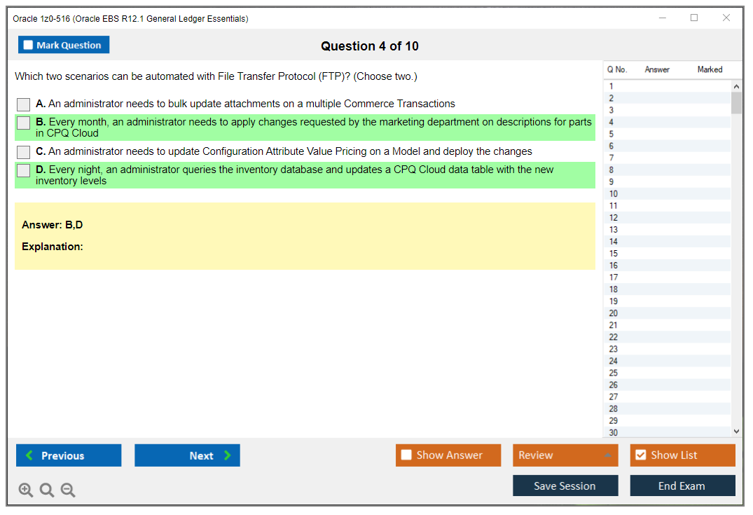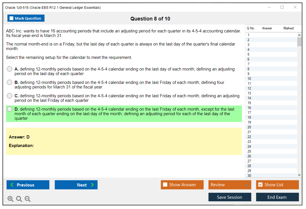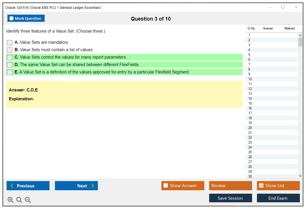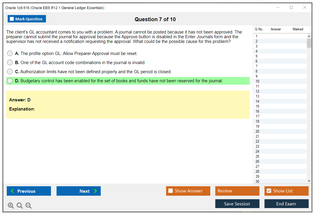 Os dumps 1z0-516 Oracle EBS R12.1 General Ledger Essentials da DumpsArena são bastante eficazes. Eles se concentram inteiramente nos elementos mais importantes do seu exame e fornecem as informações mais eficientes possíveis em um idioma interativo e fácil de entender. Considere impulsionar sua carreira com esta fórmula de aprovação de exame testada e mais autêntica. Exames cerebrais 1z0-516 são únicos e um tratamento para todo profissional de TI aspirante que deseja fazer um exame 1z0-516, apesar das limitações de tempo. Há uma grande chance de que a maioria dessas perguntas esteja no seu verdadeiro exame 1z0-516.