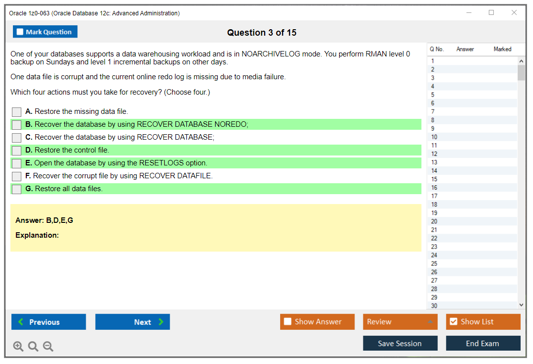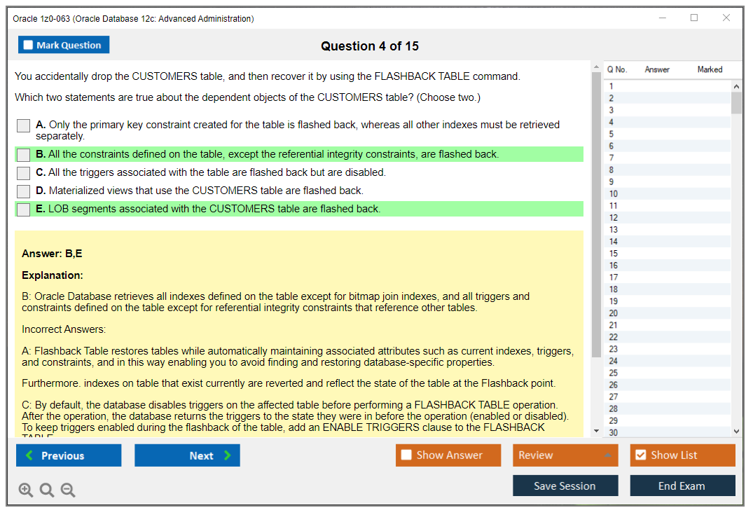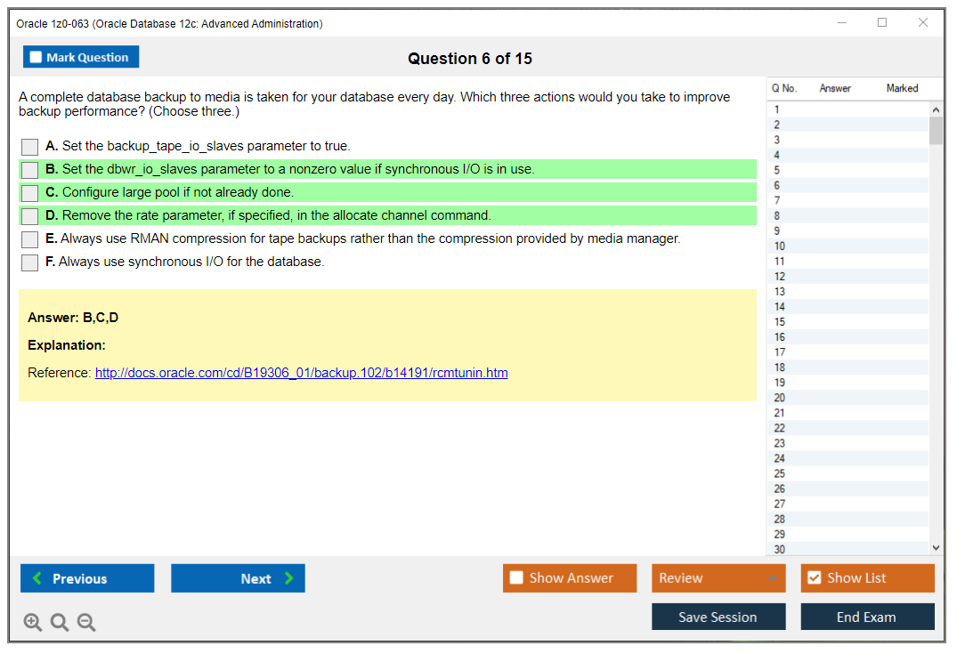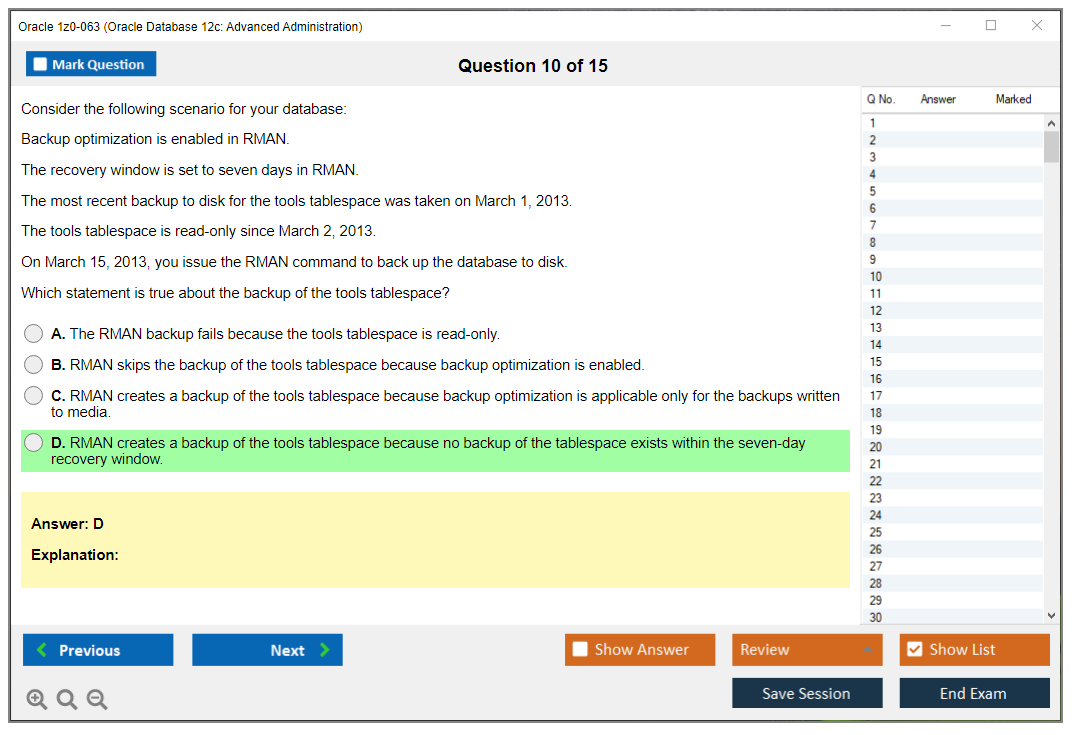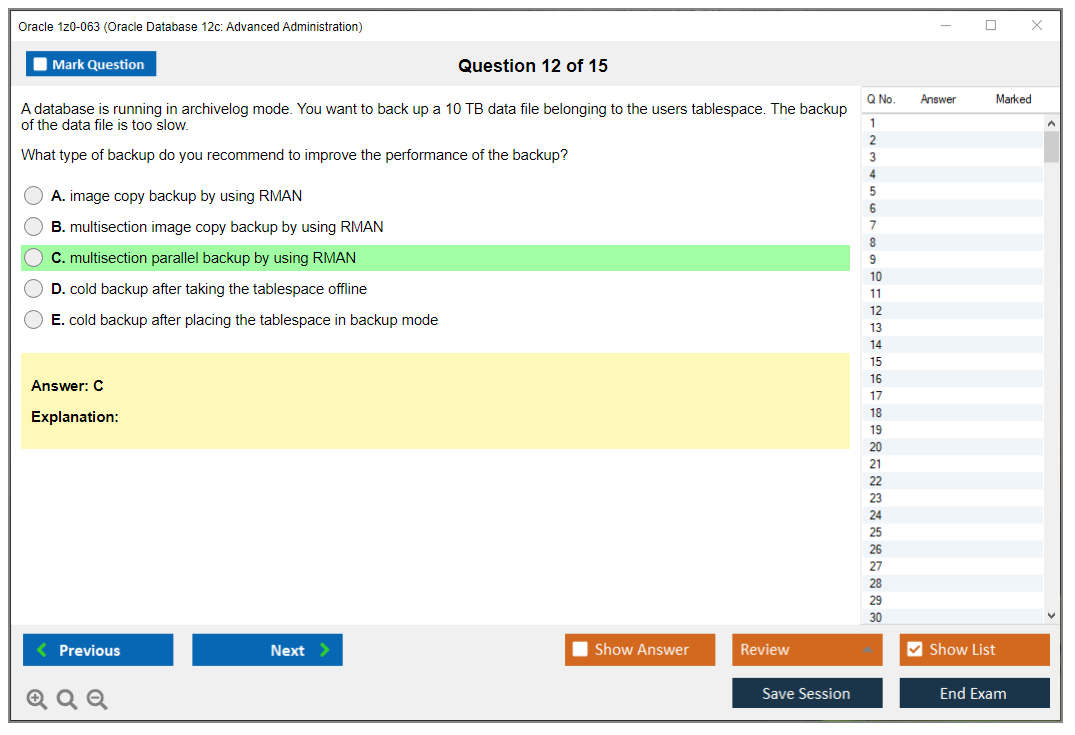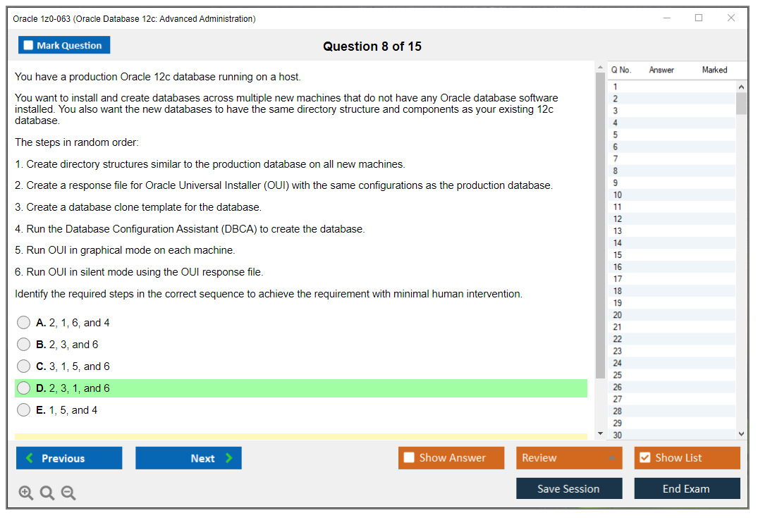 Практический тест 1z0-063 от DumpsArena позволит вам изучить все разделы учебного плана, не оставив важных моментов без внимания. Тем не менее эти 1z0-063 дампы предоставляют вам эксклюзивный, компактный и полный контент, который экономит ваше драгоценное время на поиск учебного контента и избегание траты энергии на ненужный, скучный и полный предварительного контента. Экзаменатор 1z0-063 Oracle вопросы ответы DumpsArena гораздо эффективнее знакомят с форматом и характером вопросов 1z0-063 на бумаге по сертификации ИТ.